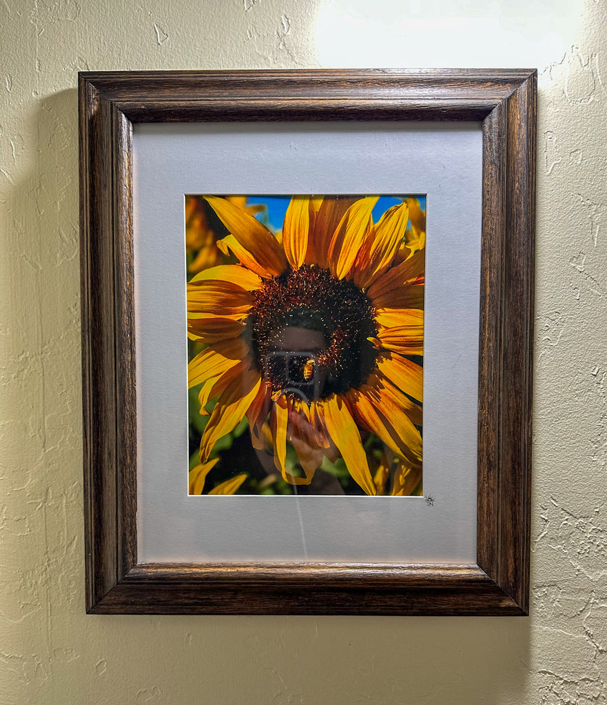 This gorgeous photo of a sunflower and bee was taken at Hawes Pumpkin Patch! Framed beautifully in a hand painted oak frame accompanied by a sawtooth hanger making it ready to hang. This is the first print, and no other prints have been made. You will be the first owner of this artwork.