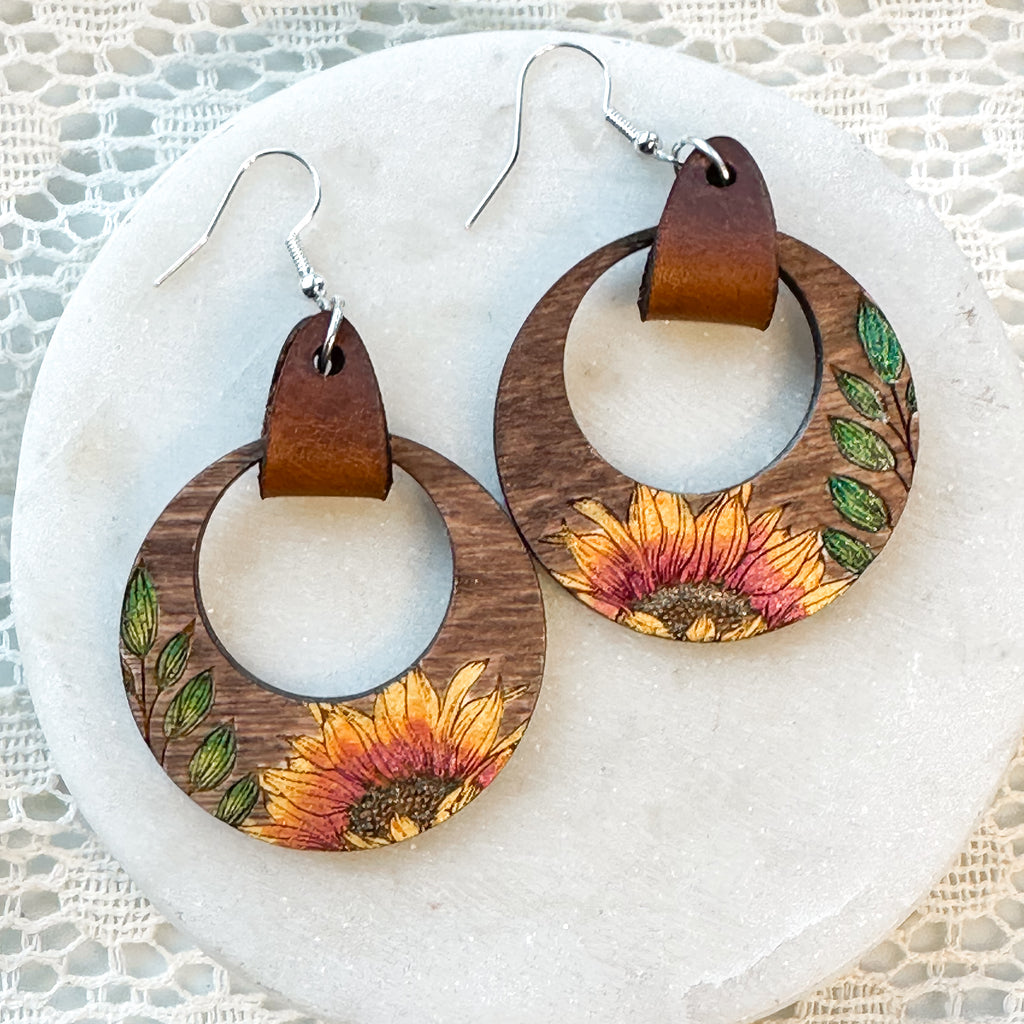 Introducing our Boho Sunflower Hoops, hand painted with glitter watercolor for a unique shine. These old bronze tinted earrings feature a leather wrap and lightweight wood design, finished with 925 silver plated findings. Elevate your style with these exclusive hoops.