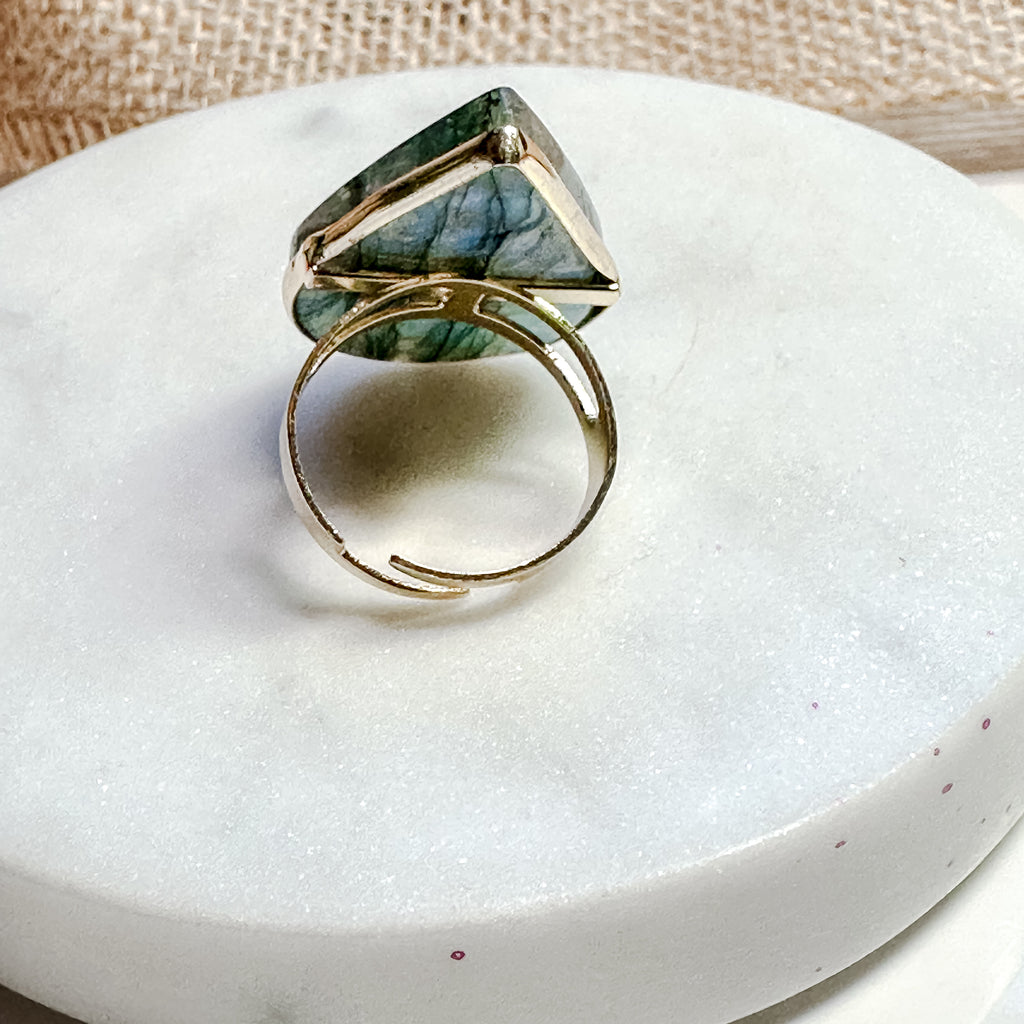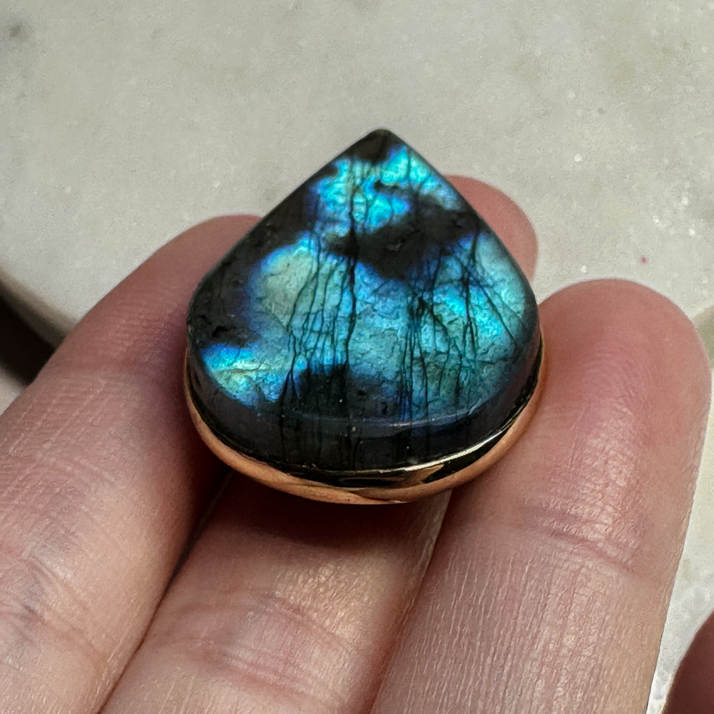 Introducing our Labradorite Adjustable Fashion Ring, featuring a mesmerizing water drop shape and super blue Schiller flash with hints of light blue. The gold tone metal alloy band is adjustable, fitting sizes 7-11. Elevate your style and add a touch of luxury with this exclusive and sophisticated accessory.
