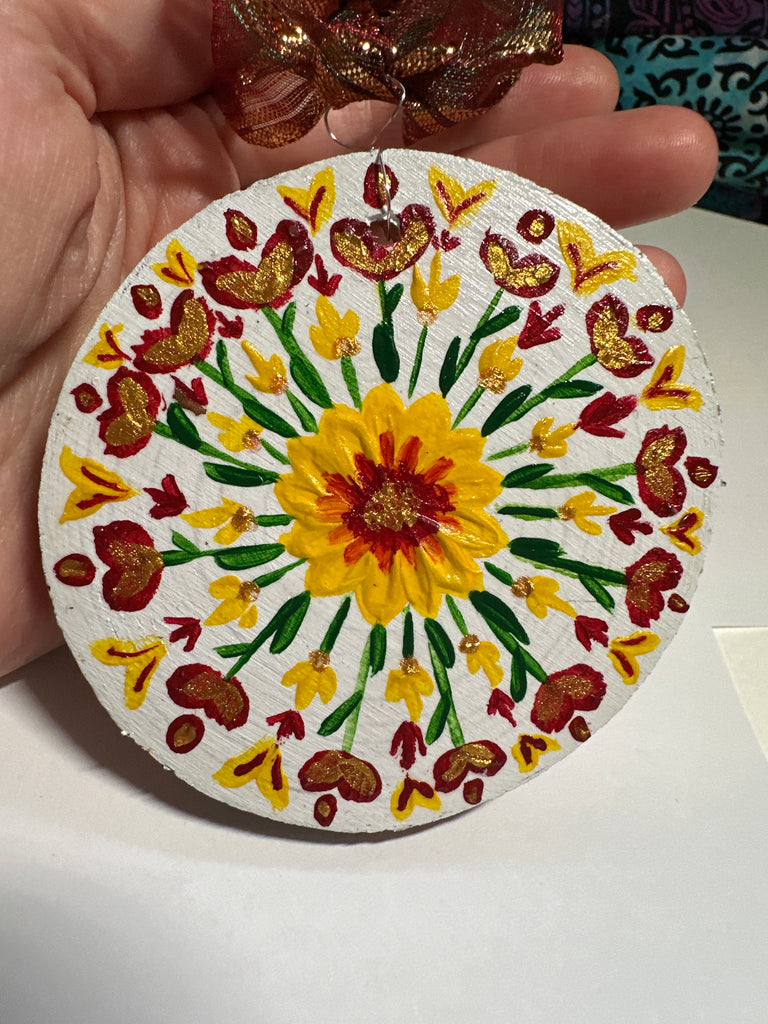 I painted these wood slice ornaments with acrylic paint and varnished them. They each have a wire bail and decorative ribbon attached. They will be signed on the back before being shipped.