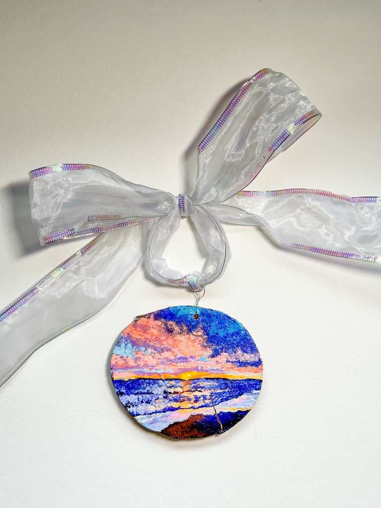 **The Ocean Sunset ornament has a split in the slice, that is a natural feature of the wood. I painted over it and varnished it.