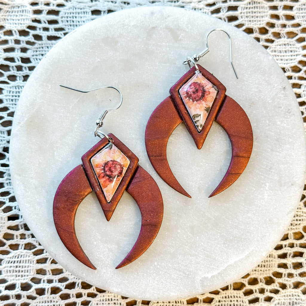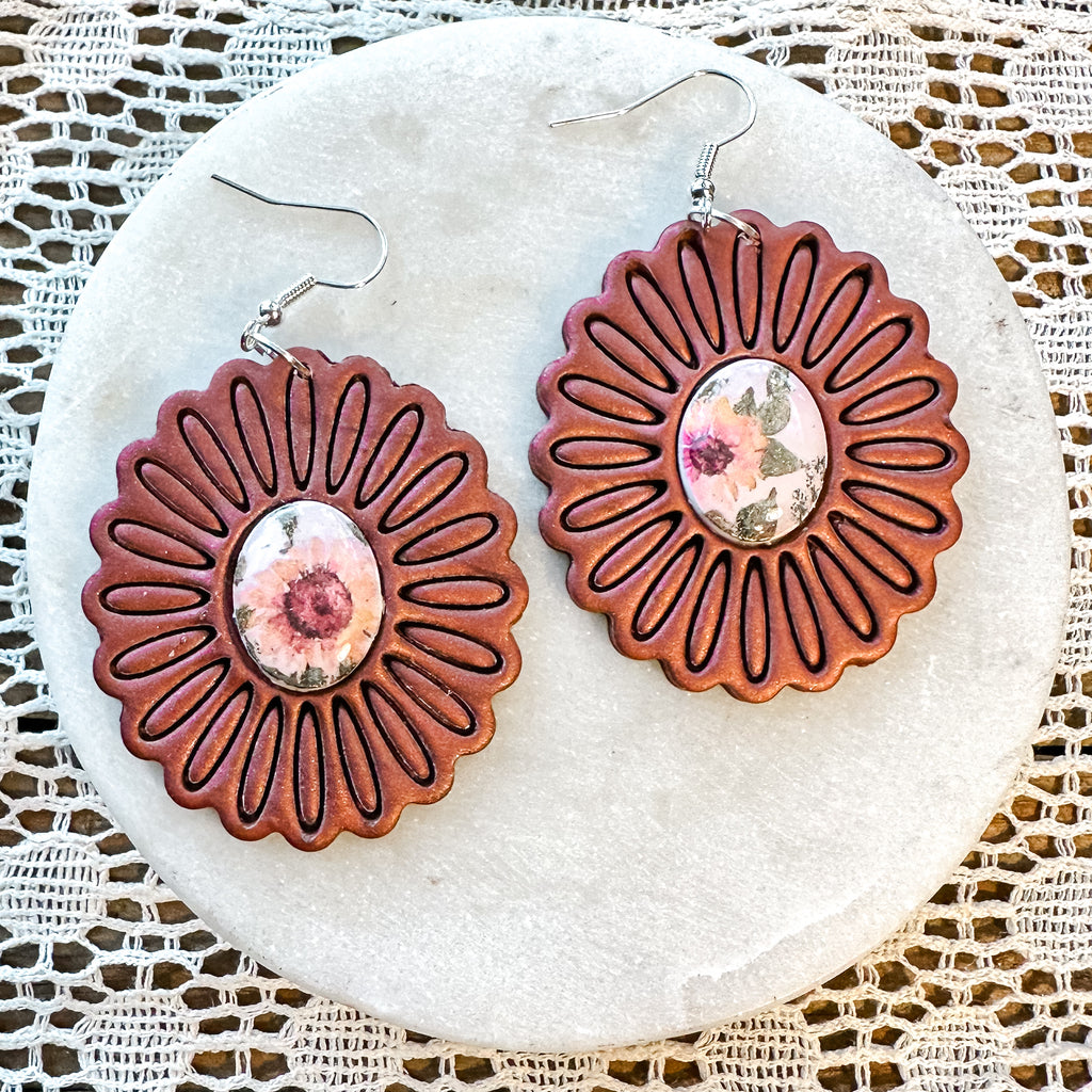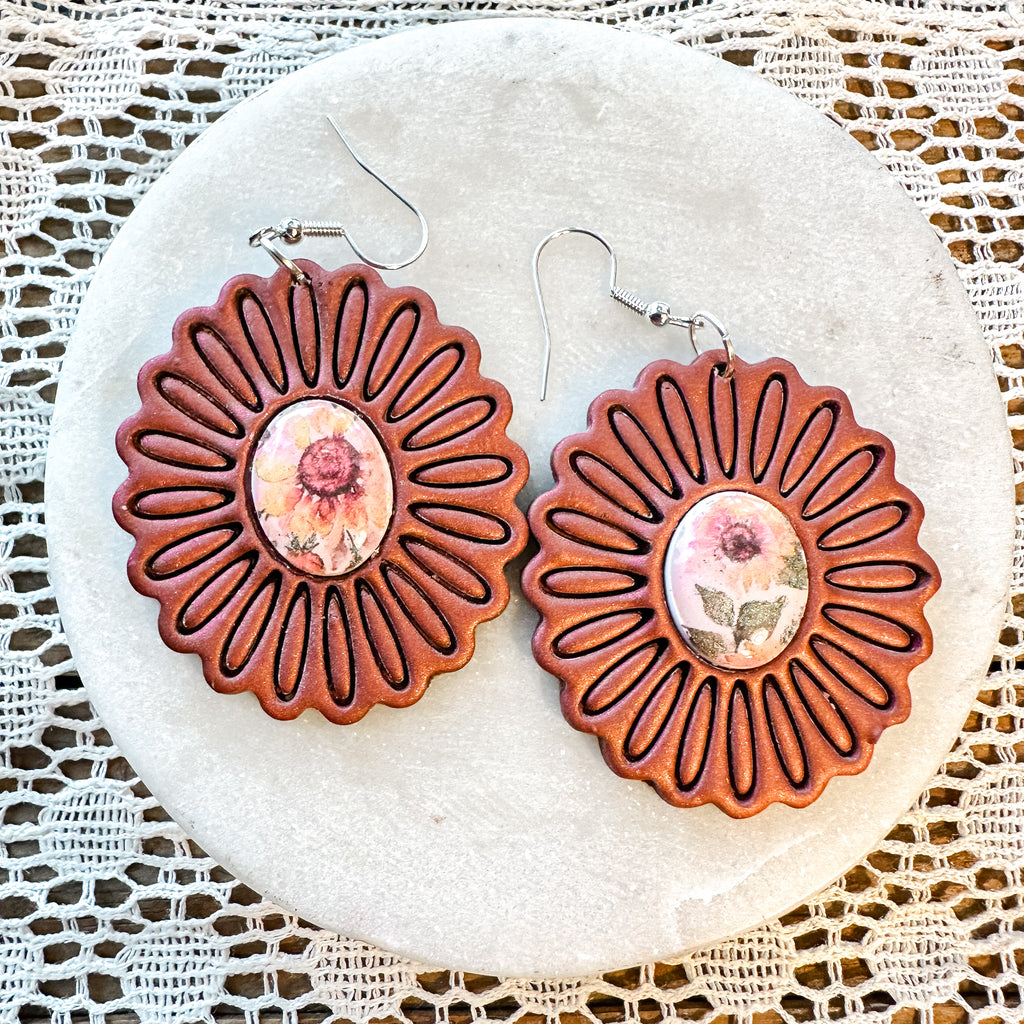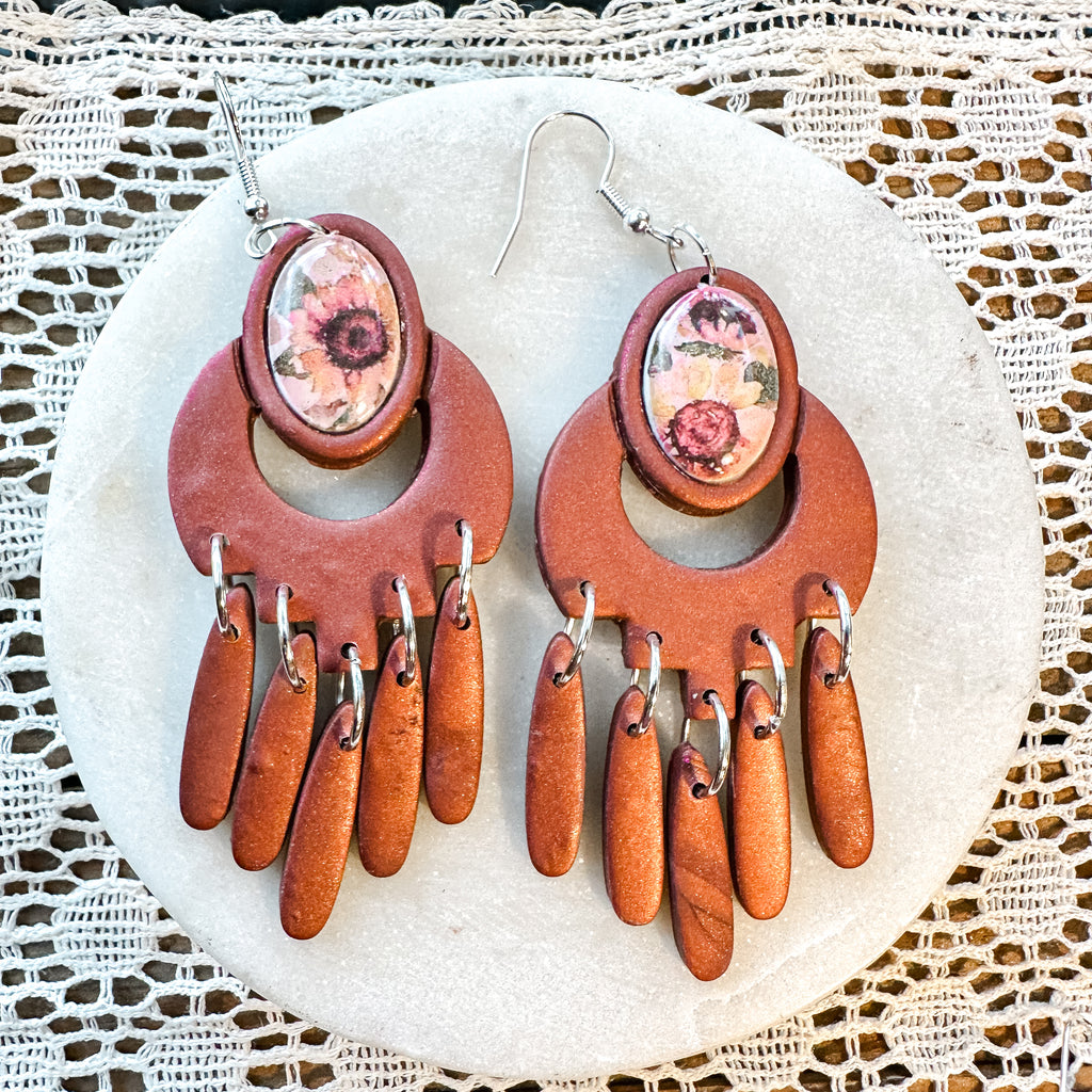 Step into a never-ending field of sunflowers with Sunflower Fields Forever! This stunning collection features handmade polymer clay earrings in a bronzed copper hue and sunflower faux stones surrounded by delicate bezels. Lightweight and finished with 925 silver plated findings, these earrings will add a touch of nature-inspired beauty to any outfit.