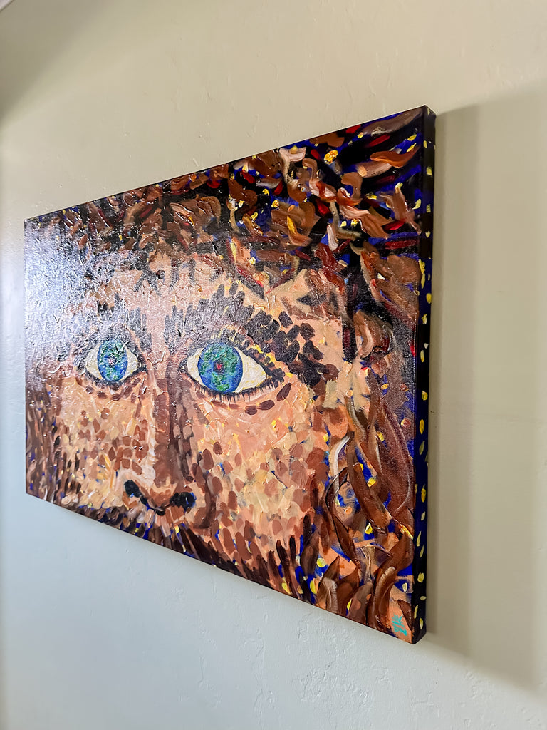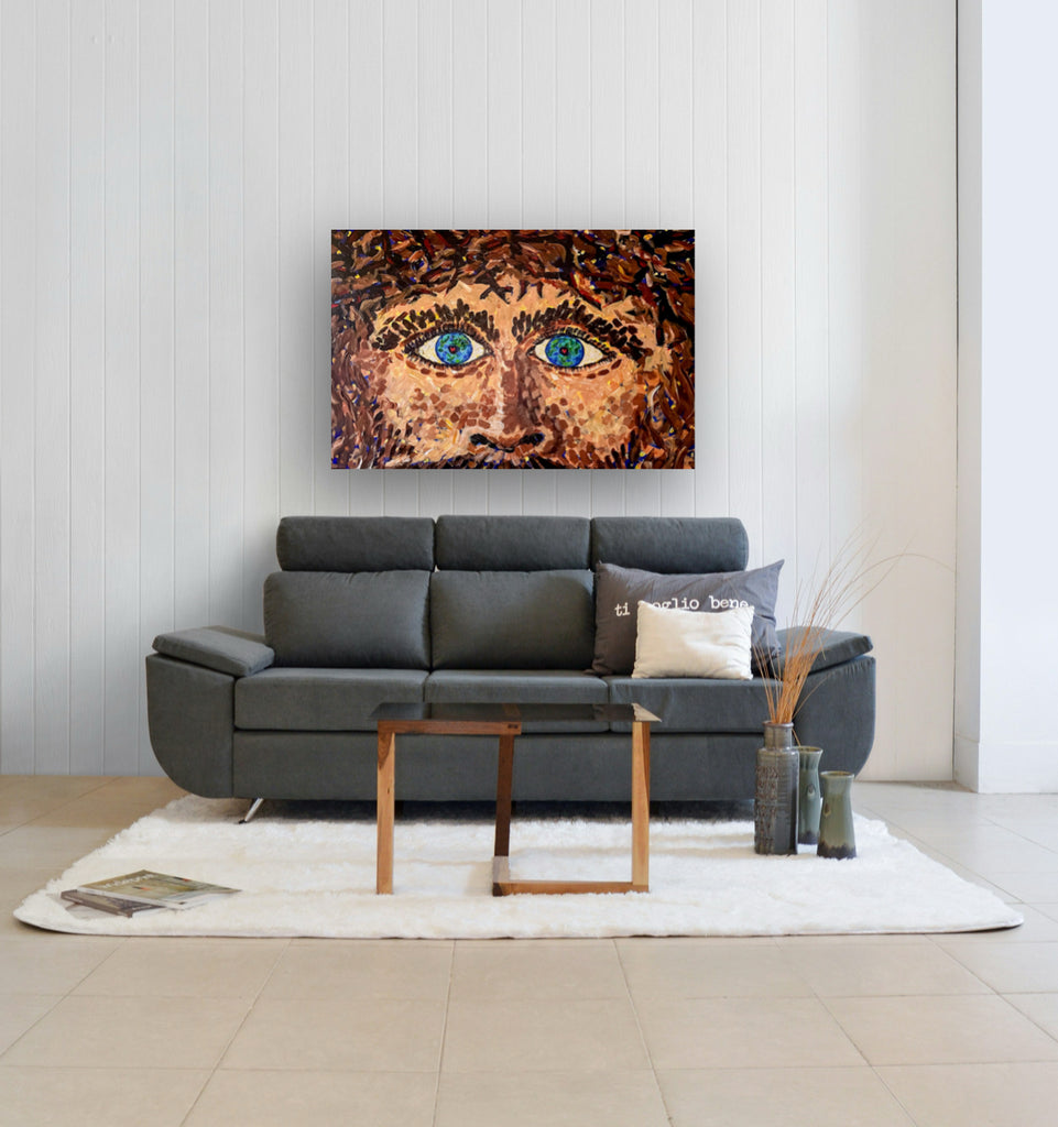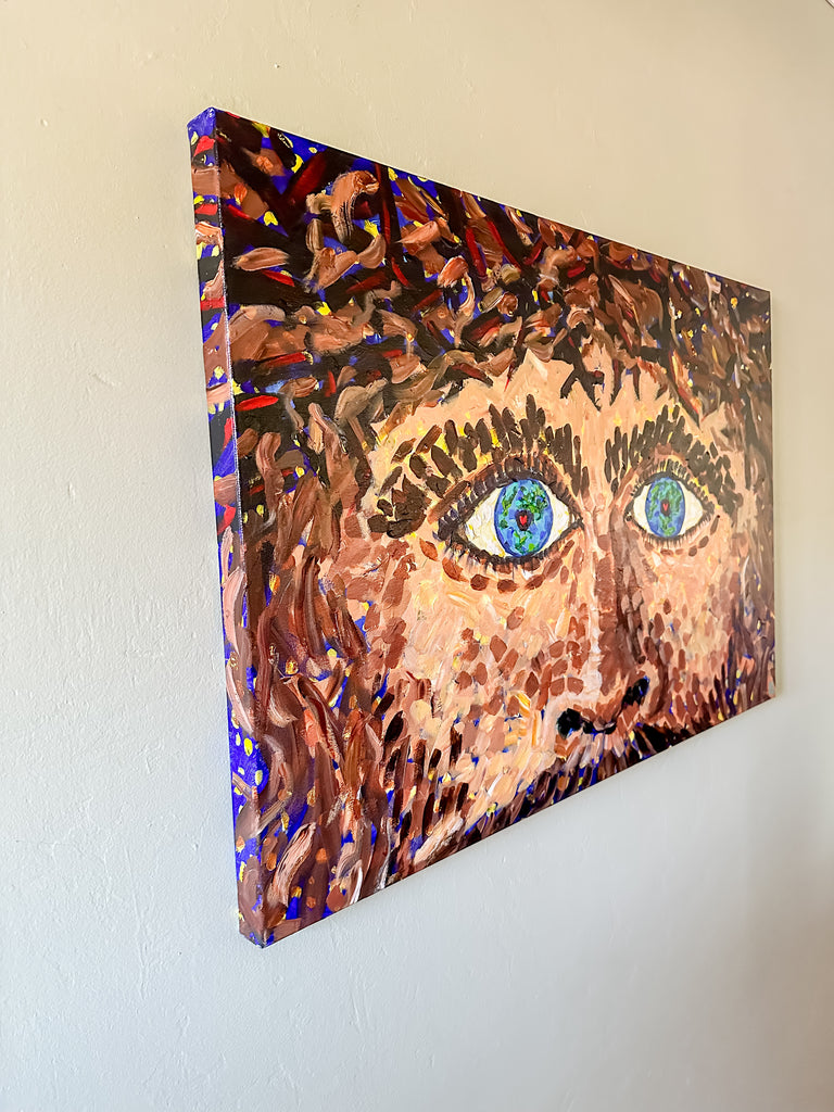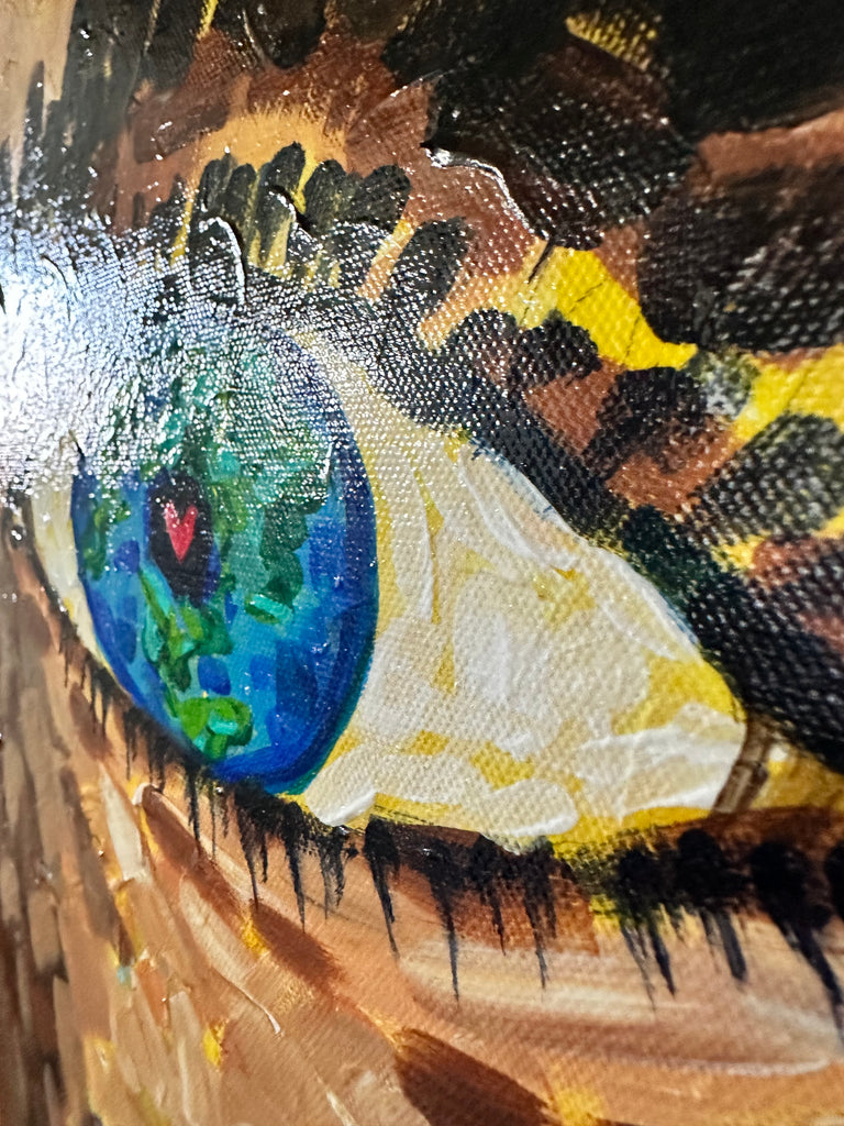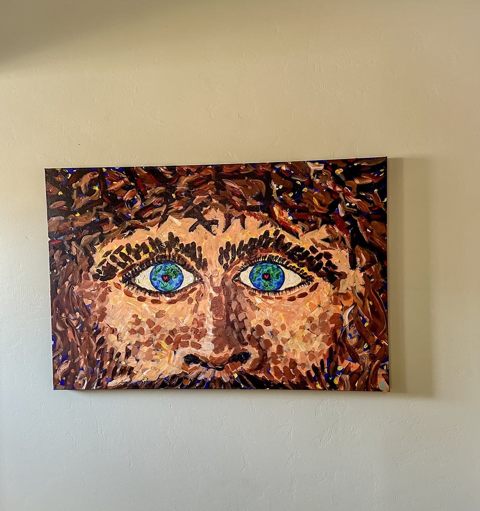 This painting is a visual representation of a vision that I had of Jesus Christ. I saw His face with the crown of thorns on His head, and I saw His eyes. They were the most beautiful blue green color that you could ever imagine, and his eyes were also the Earth. He told me, “the world is on My Heart”. Upon the completion of this painting, the Holy Spirit revealed to me that when the church is raptured from the Earth, that we will be taken out in His perfect love. He also revealed that the lines in the corners of the eyes represent the pillars of the foundations of the earth, and that the anatomy of the eye symbolically represents the firmament above the Earth. The firmament of the Earth is mentioned in Genesis chapter 1.